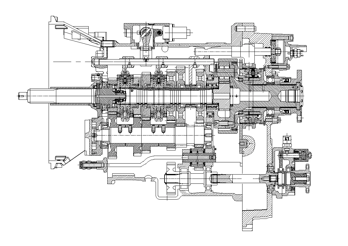 This series of transmissions are composed of a two-stage structure of a main box and an auxiliary box. The main box has 4 forward gears, a crawling gear and a reverse gear, and the auxiliary box has 2 gears, a total of 9 forward gears and 1 reverse gear. The main and auxiliary boxes are interlocked to protect the auxiliary box synchronizer.
